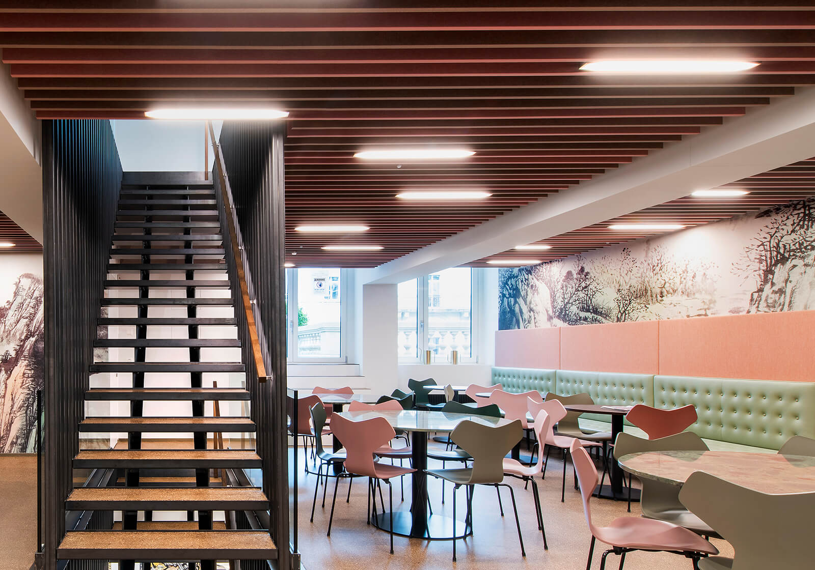 Akustisch wirksame Massnahmen in Form von dekorativen Baffeln aus PET sorgen zusammen mit dem leistungsstarken Hochleistungsmodul, Typ HLM-V, im zeitweise stark frequentierten Aufenthaltsraum für akustische Behaglichkeit und eine einladende Atmosphäre. Der erhöhte konvektive Leistungsanteil des Hochleistungsmoduls erbringt eine effiziente und zugfreie Klimatisierung – für entspannte Pausen in einem behaglichen Ambiente.